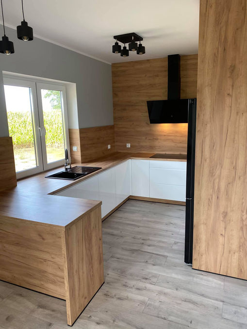Kuchnia w stylu loftowym - czarne matowe fronty, idealnie komponująca się z dekorem Egger Sherman Koniakowy. Dodatkowo wyposażona w nowoczesne systemy takie jak: System Space Tower, Magic Corner, segregacja odpadów z systemem Servo Drive.